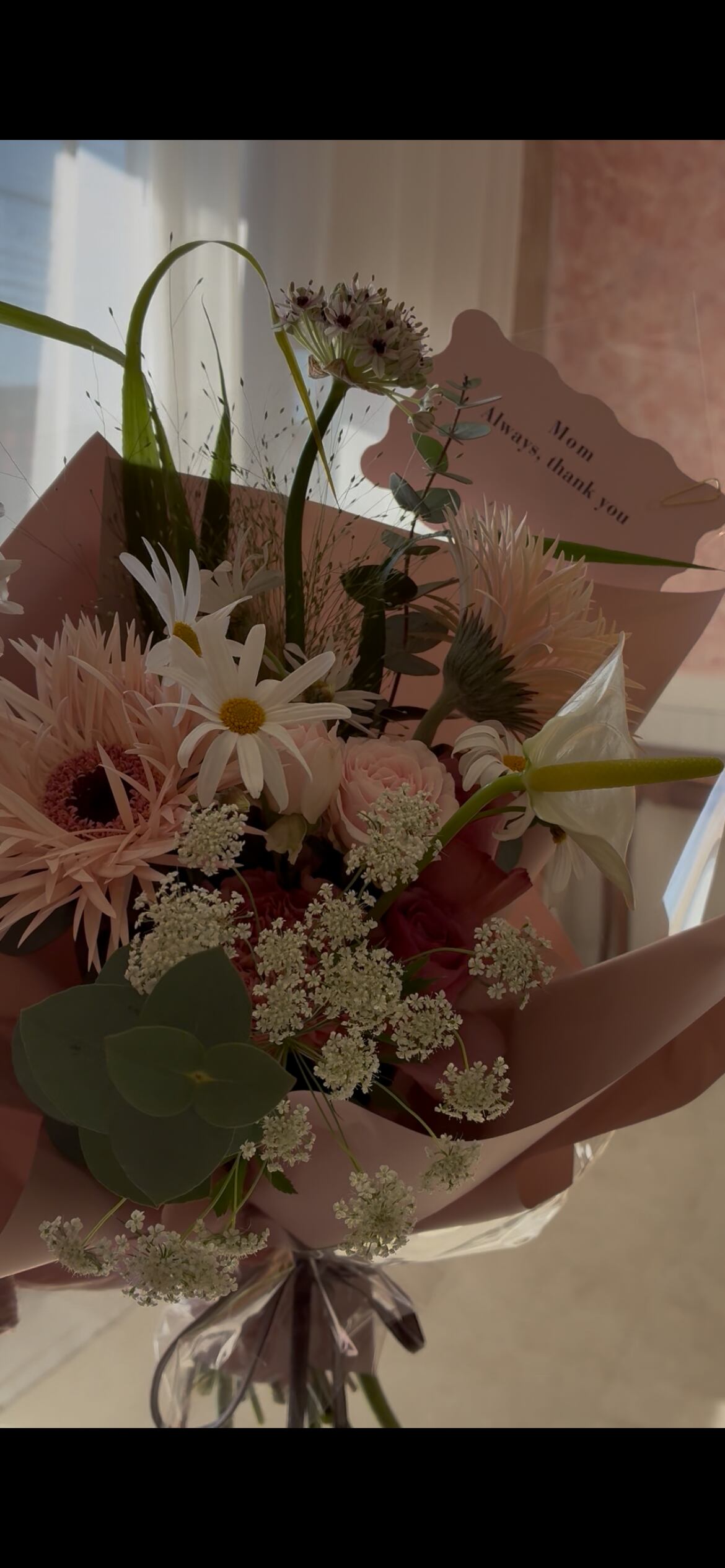 カーネーション、芍薬、バラ、ガーベラ等をメインに束ねさせて頂きます。